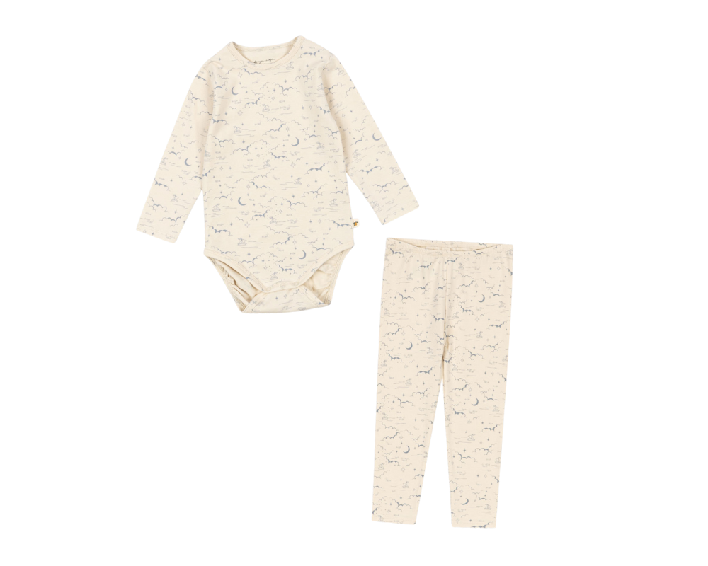 This cozy two-piece newborn set is crafted from soft, GOTS-certified organic cotton mixed with elastane for durability and a gentle stretch. The long-sleeved body is designed with snap buttons at the crotch for easy dressing and diaper changes, while the matching basic pants feature a flexible elastic waistband for a comfortable fit. Finished in a calming beige shade with a charming print of blue moons, clouds, stars, and boats, this set keeps your little one snug and comfortable. GOTS, Organic, certified by CU1094701.