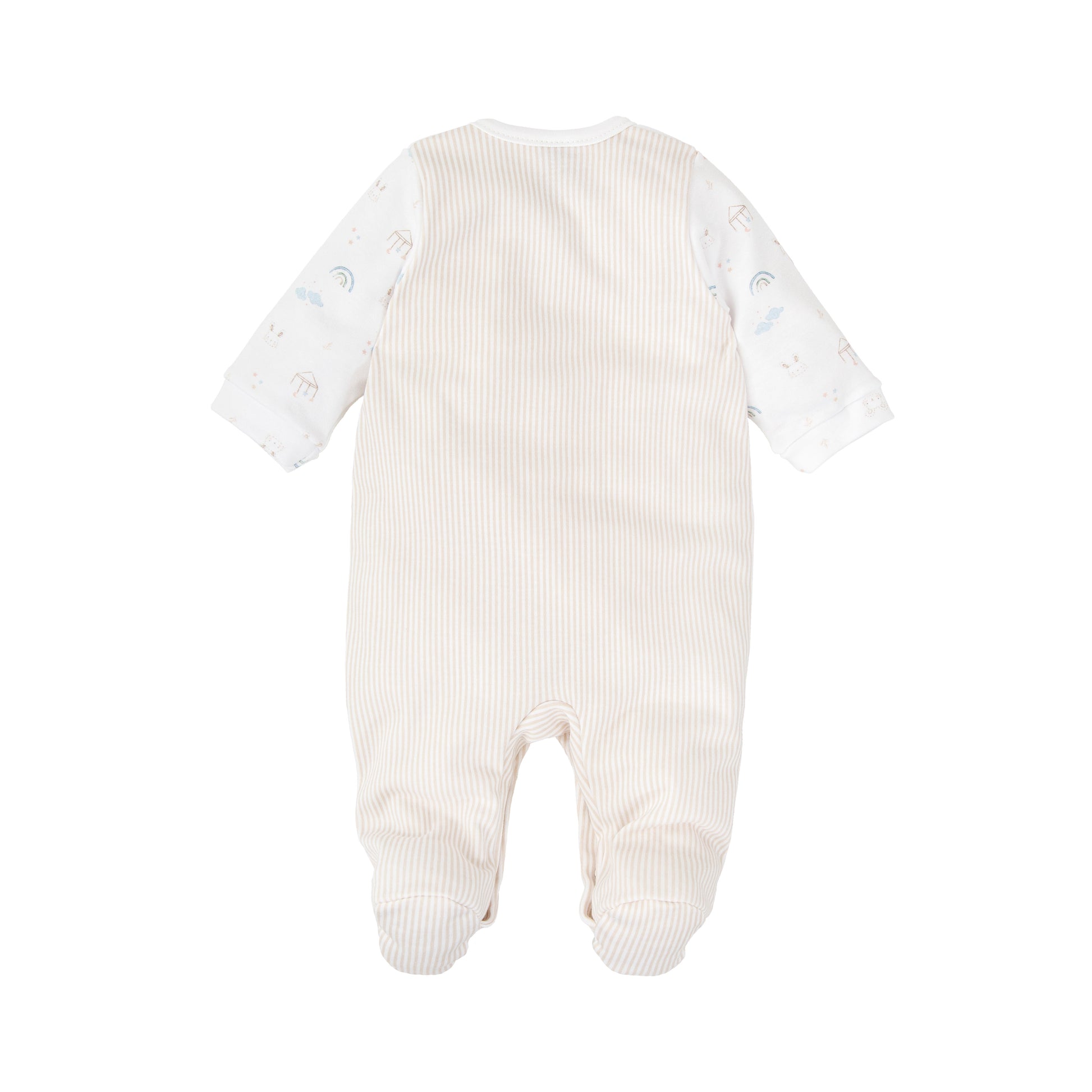 Adorable and comfortable footie pajama designed for all-day and nighttime wear. The top features a charming pastel print with rainbows, clouds, and animals, while the bottoms showcase beige and white stripes for a playful contrast. White buttons run down the middle and along the legs for easy changes. Covered feet keep little toes warm, each adorned with a tiny rainbow and cloud for an extra-sweet touch. Pairs perfectly with the matching blanket, towel, bib, and onesie for a coordinated set.