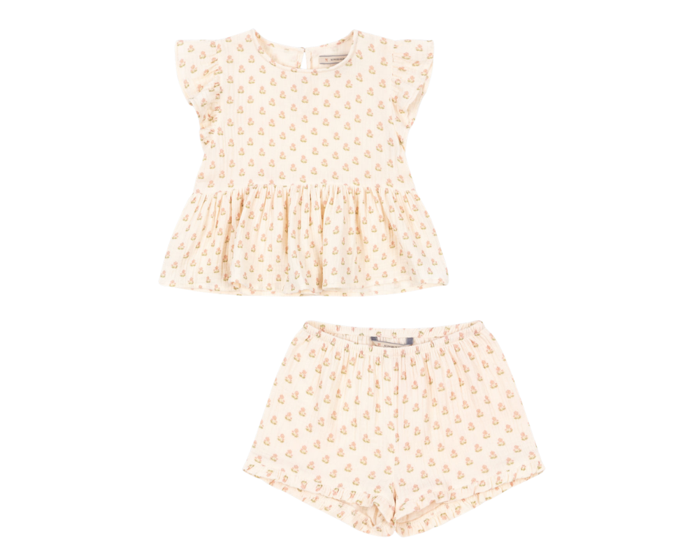 Soft top in a light and breathable muslin quality. The Coco top is designed in a delicate peplum silhouette with a skirt effect. Closes with a single button in the back. This is paired with the matching light pants in a soft muslin quality that feels light and breathable - a perfect summer staple. The set is white with pink little flowers throughout.