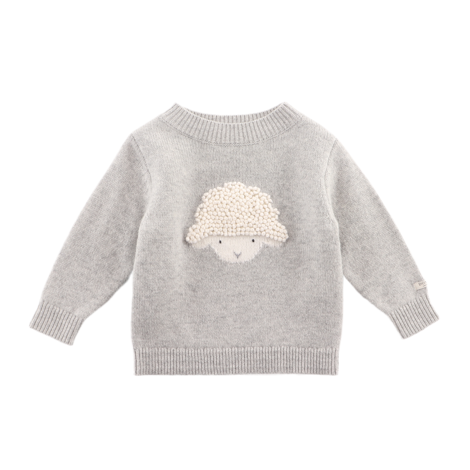 My charming little lammy! The Denn Sweater is a winter essential! Easy to slip on, featuring a playful sheep embroidered character, your little one won't want to take it off. A great unisex sweater. We recommend this with the matching trig pants.