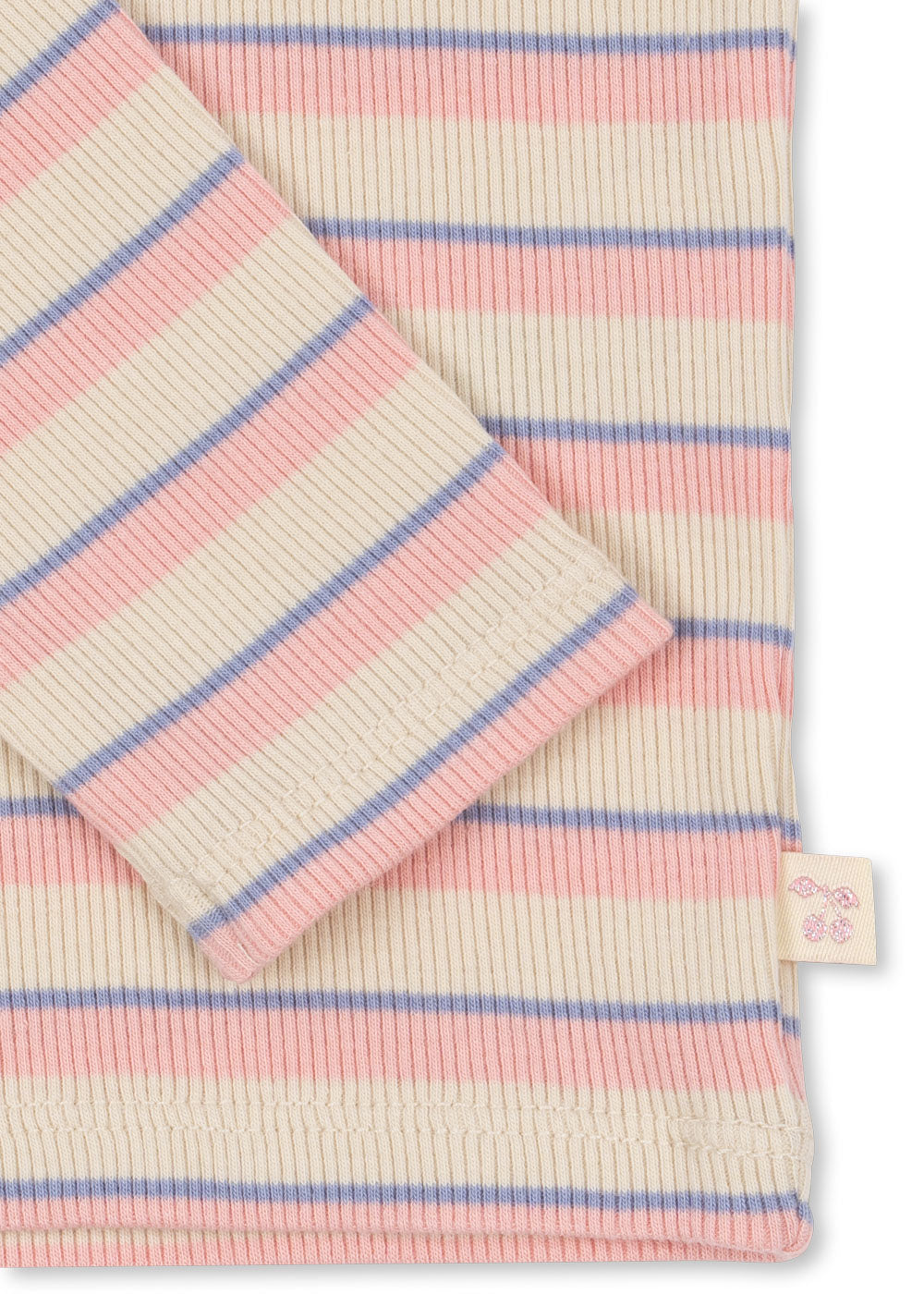 A sweet long-sleeve blouse and pants set designed for everyday comfort. The blouse comes in a soft rib quality with a classic fit, round neckline, and a delicate little bow for the perfect finishing touch. Paired with casual loose-fit pants featuring a comfy elastic waistline, both pieces are woven in flexible rib for extra ease of movement. The pieces are beige with red small cherries and hearts printed throughout. Made from 100% GOTS-certified organic cotton (certified by CU1094701).