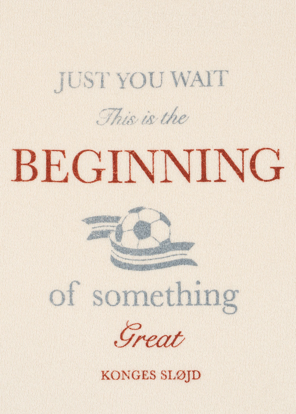 Soft terry tee made in fluffy organic cotton terry fabric. Designed in a casual silhouette with dropped shoulders and a boxy fit. Shirt says just you wait this is the beginning of something great, with a soccer ball in the middle. GOTS, made with 80% organic materials, certified by CU 1094701