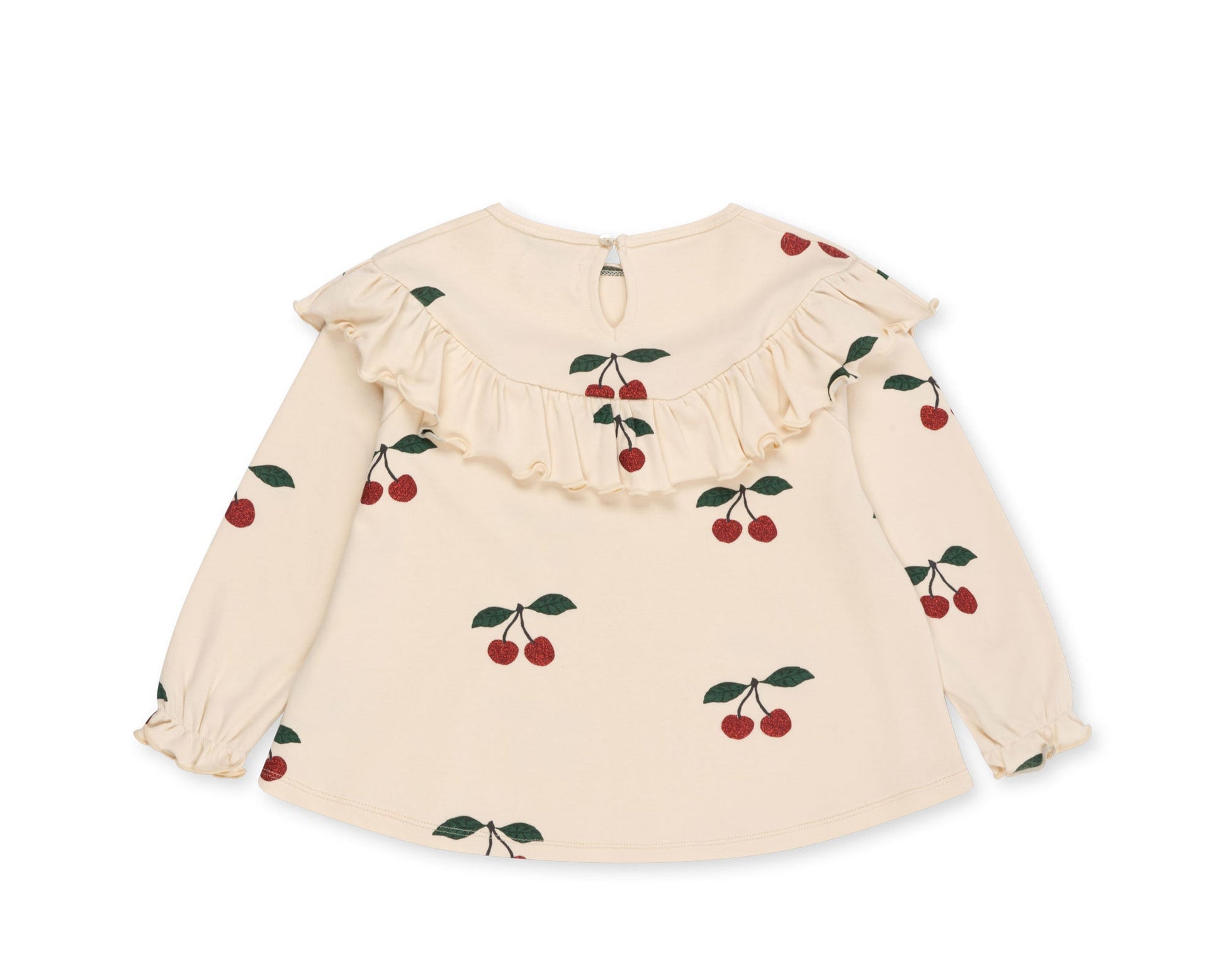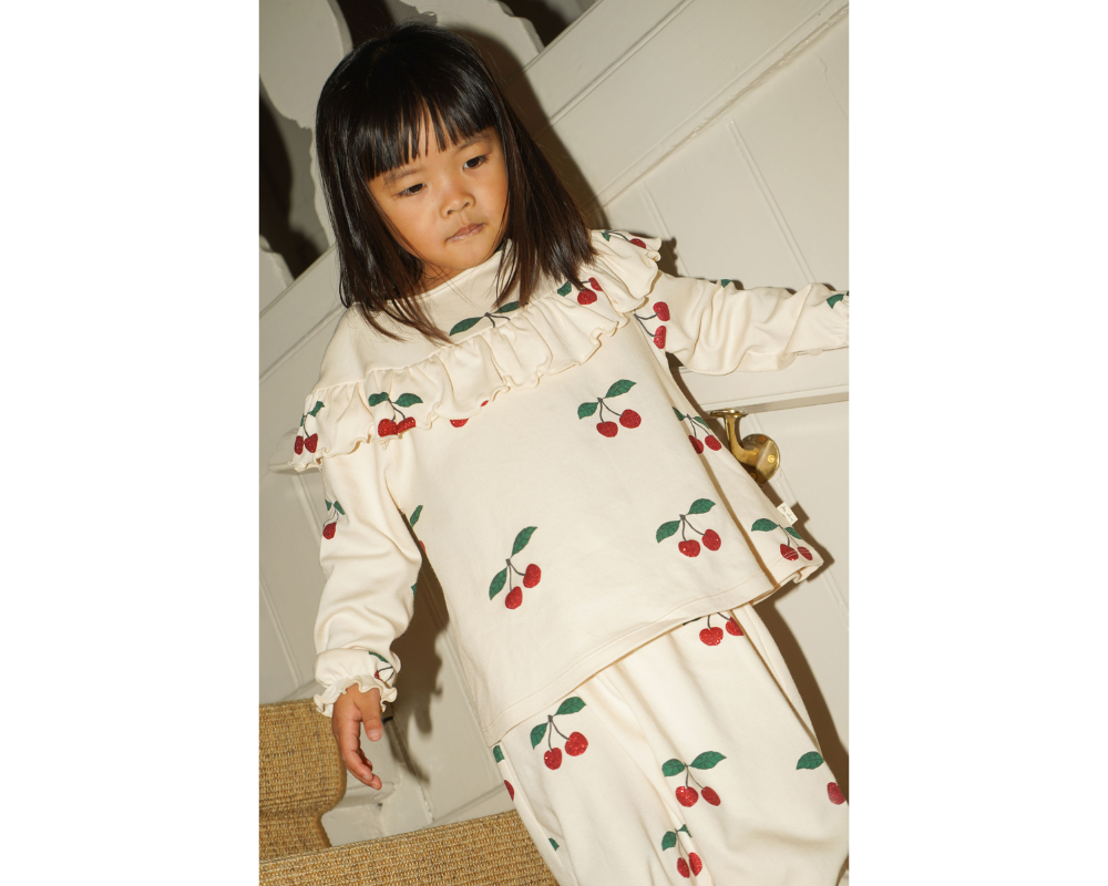 Sweet dreams just got sweeter. This cozy two-piece set features a long sleeve top with playful ruffle detailing and matching pants, both sprinkled with Konges Slojds' signature cherry print—finished with a subtle glitter shimmer for a touch of sparkle. Made from soft, breathable fabric with gentle elastic at the cuffs and ankles, it’s designed for all-day comfort and easy movement. Perfect for lounging, playing, or bedtime snuggles.