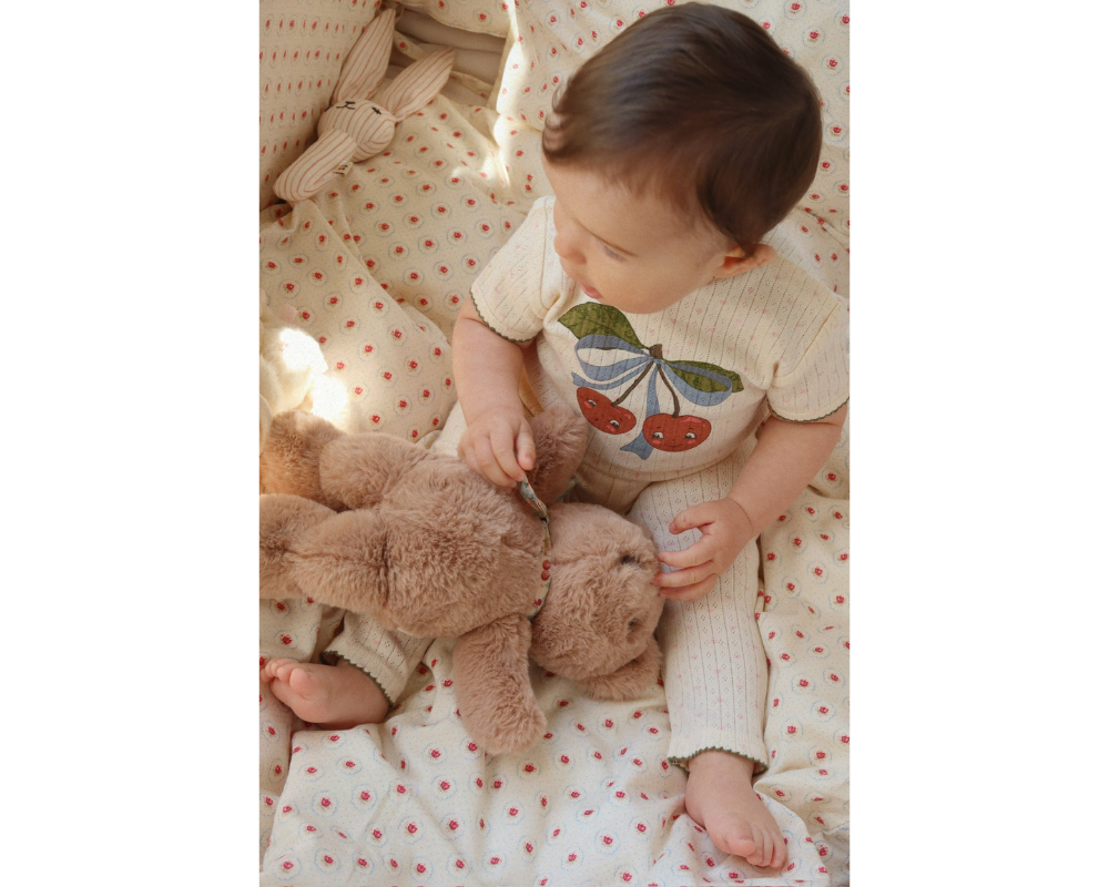 The Minnie Coeur Set is a beautiful and comfortable set for your baby girls. Created with comfort and looks in mind, the bodysuit is short sleeves with little pink hearts printed throughout and a cherry in the middle. The design is elevated with green stitching on the neckline and wrists. The set is perfect for everyday wear to keep your little ones elegant, cute and comfortable. The bodysuit snaps at the crotch for easy changes. Comfortable enough for day and night too!
