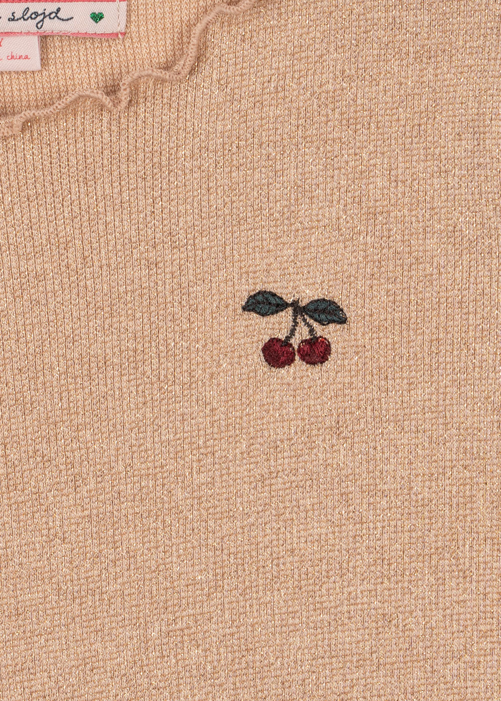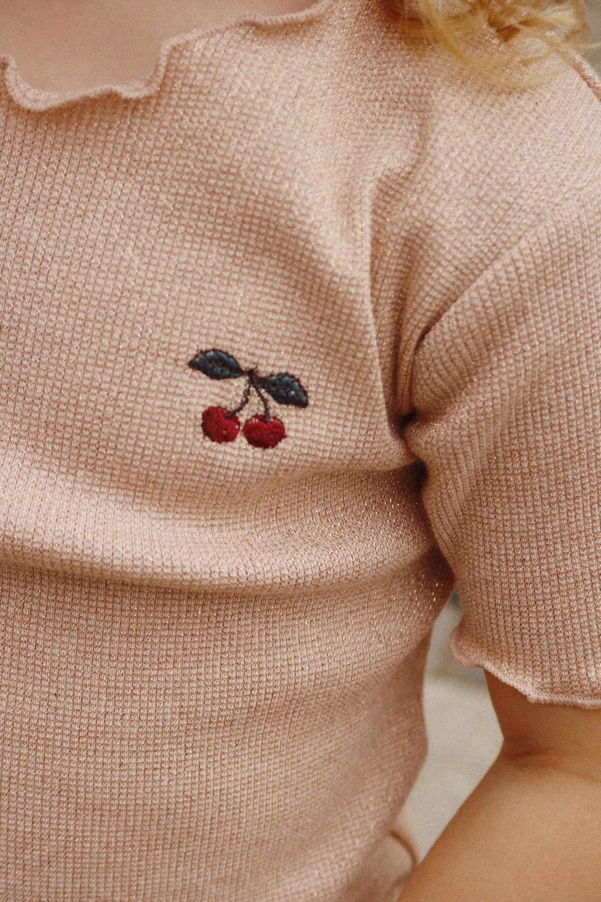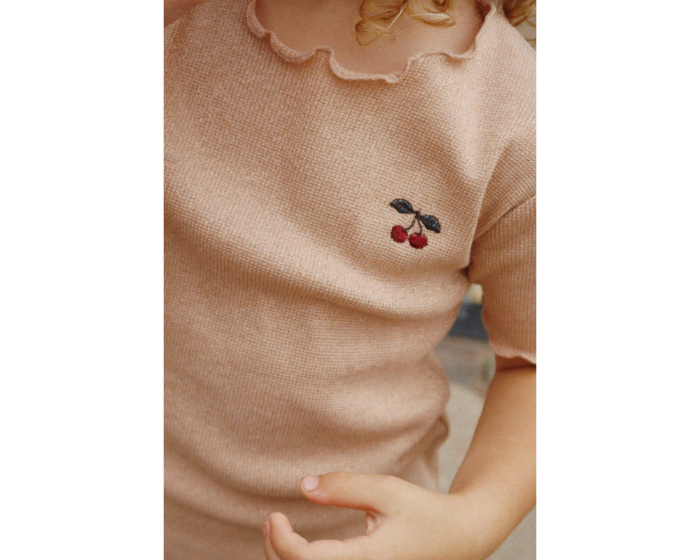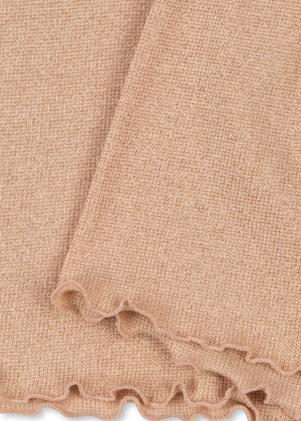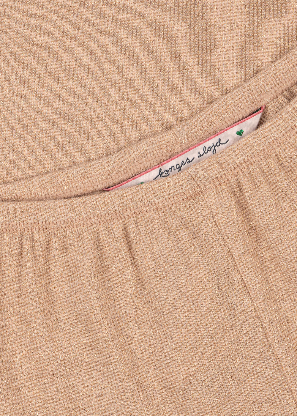 Soft set with a light tee and shorts made in a stretchy rib. Roli is a perfect everyday set made in an organic cotton blend that is woven with a little bit of lurex for a little bit of shine. Designed with a decorative picot edge around the neck line. This product contains at least 50% OCS certified cotton, certified by CU1094701