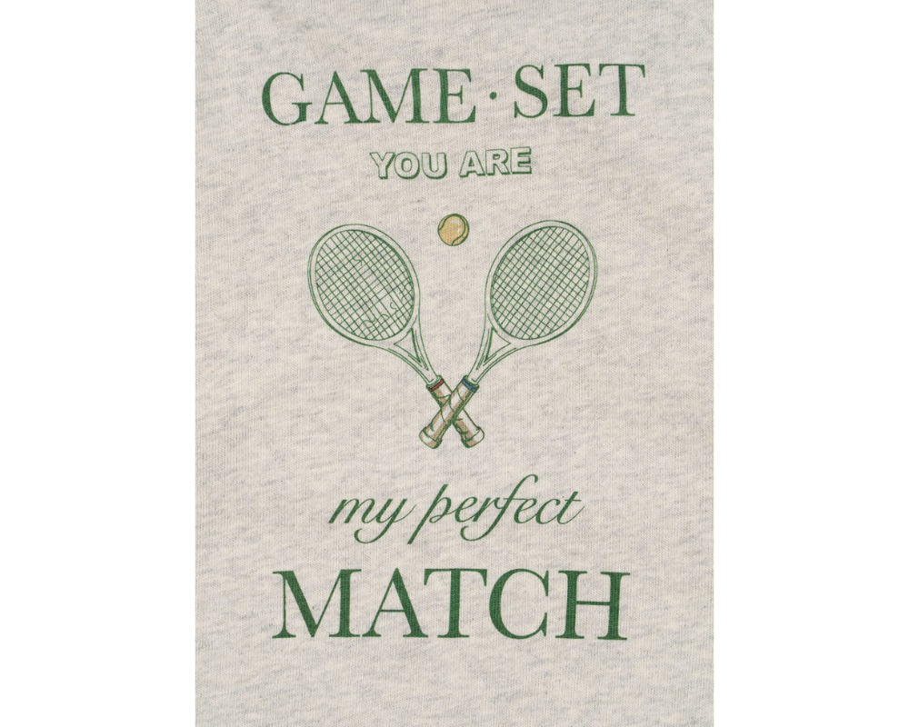Long-sleeved polo shirt with a regular collar. Made in a soft and warm sweatshirt quality. The back says game set you are my perfect match with tennis racquets. 100% organic cotton GOTS, Organic, certified by CU1094701