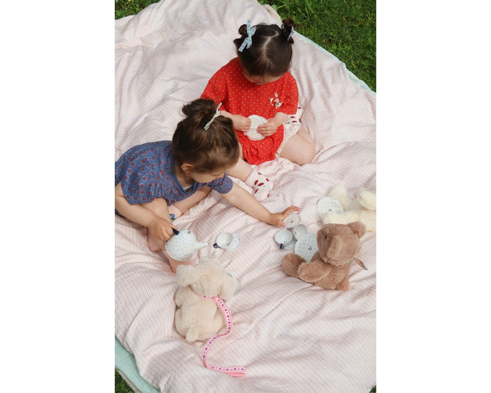 Let's have a tea party! With our complete toy tea set made from durable tin, it's time to host the most lavish little gatherings Designed for hours of immersive pretend play, the tea party set encourages little ones to use their imagination while pouring and serving for their little friends. Includes 13 pieces: a teapot with a lid, 4 cups, 4 saucers, and 4 plates. WARNING! CHOKING HAZARD. Small parts. Not suitable for children under 36 months. CE marked